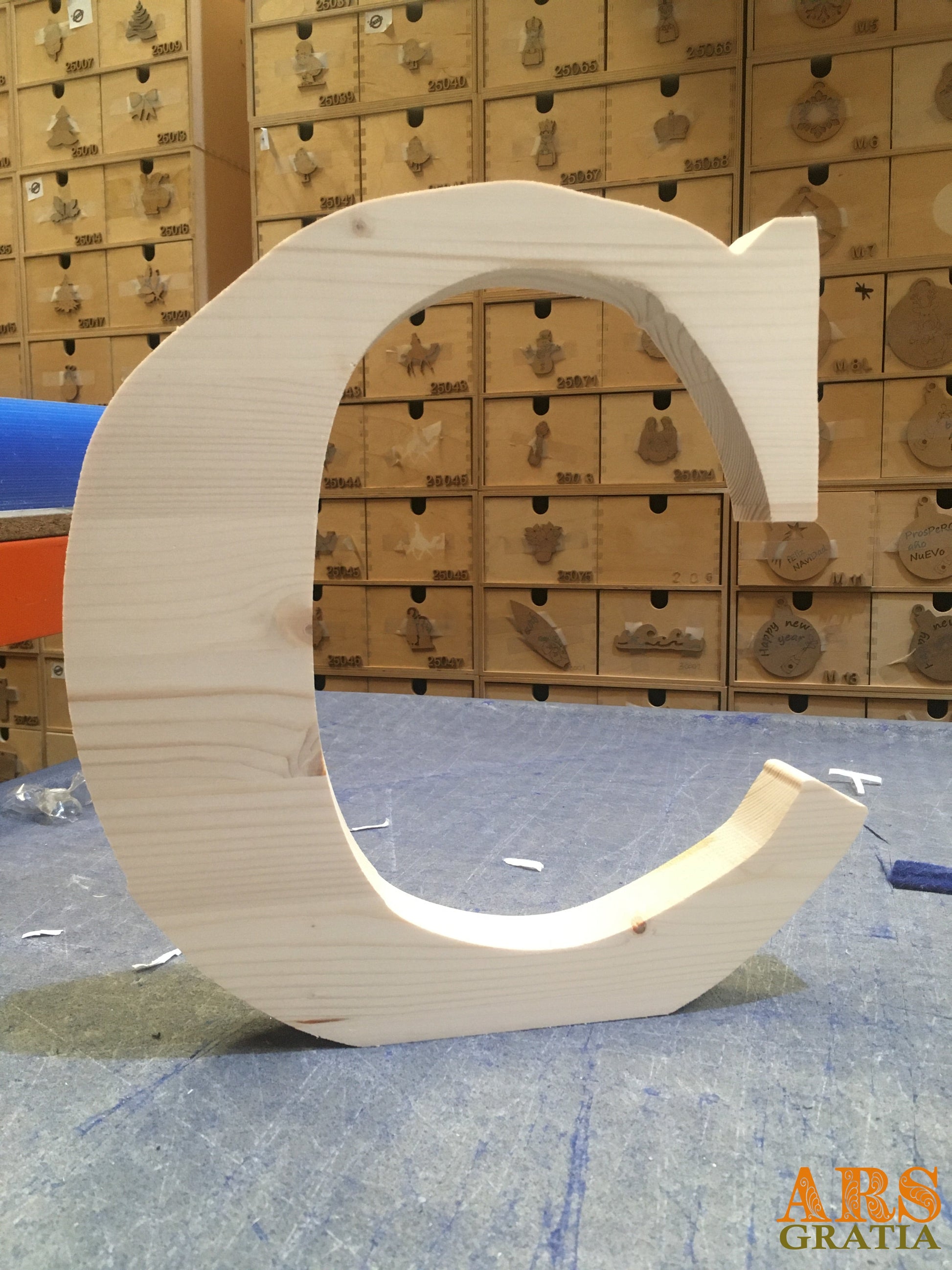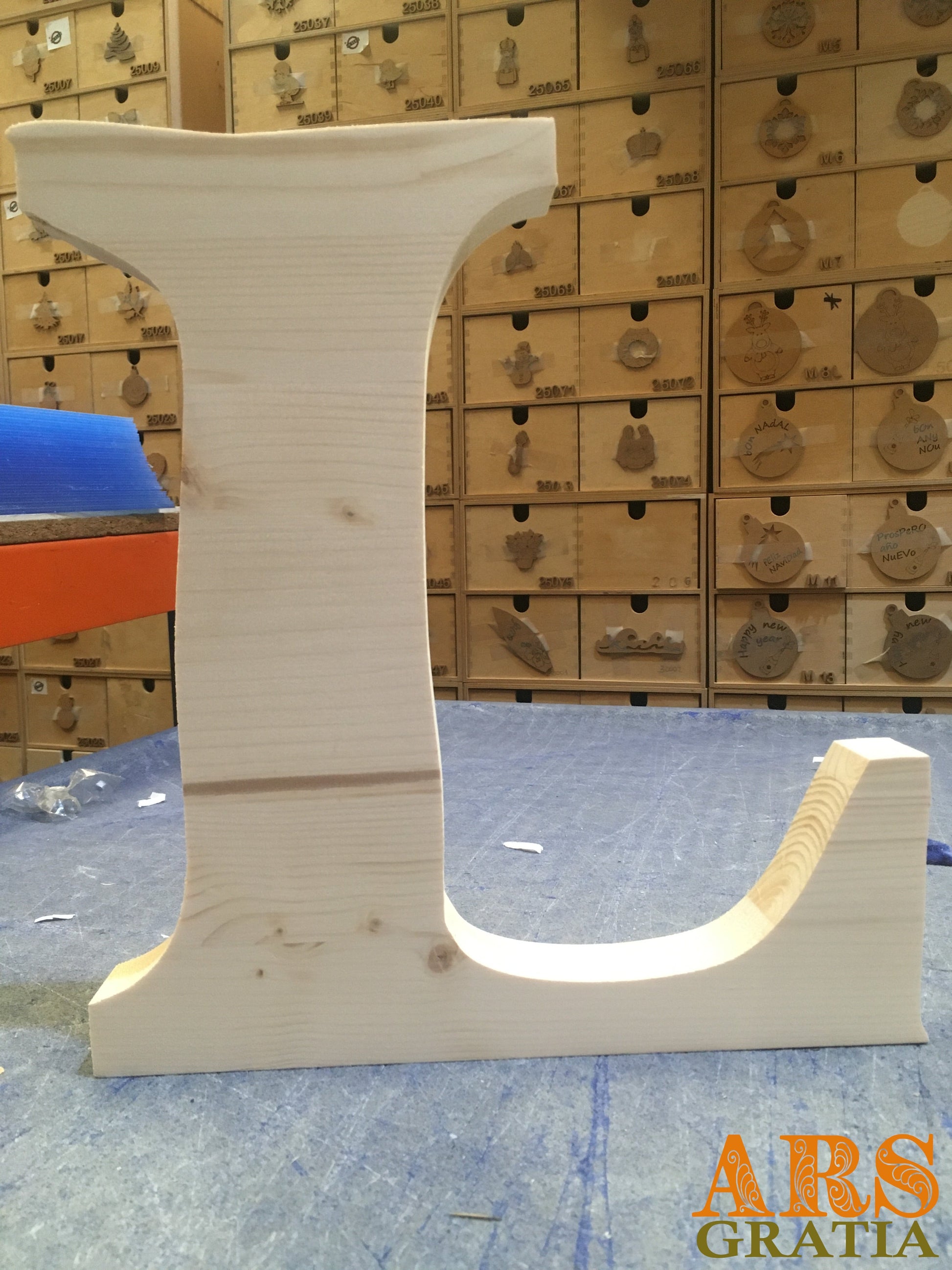 Letras grandes de madera natural de Pino/Abeto, de 3 cms de grosor y 30 cms de alto.